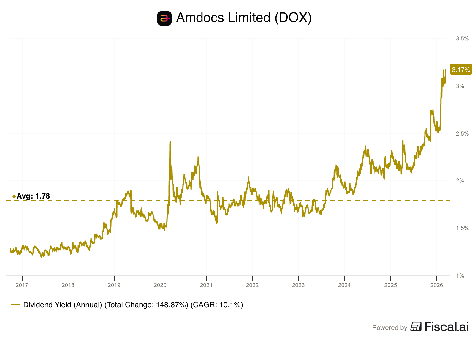 Amdocs is currently offering a yield above 3%, well above its 10-year average of 1.8%.