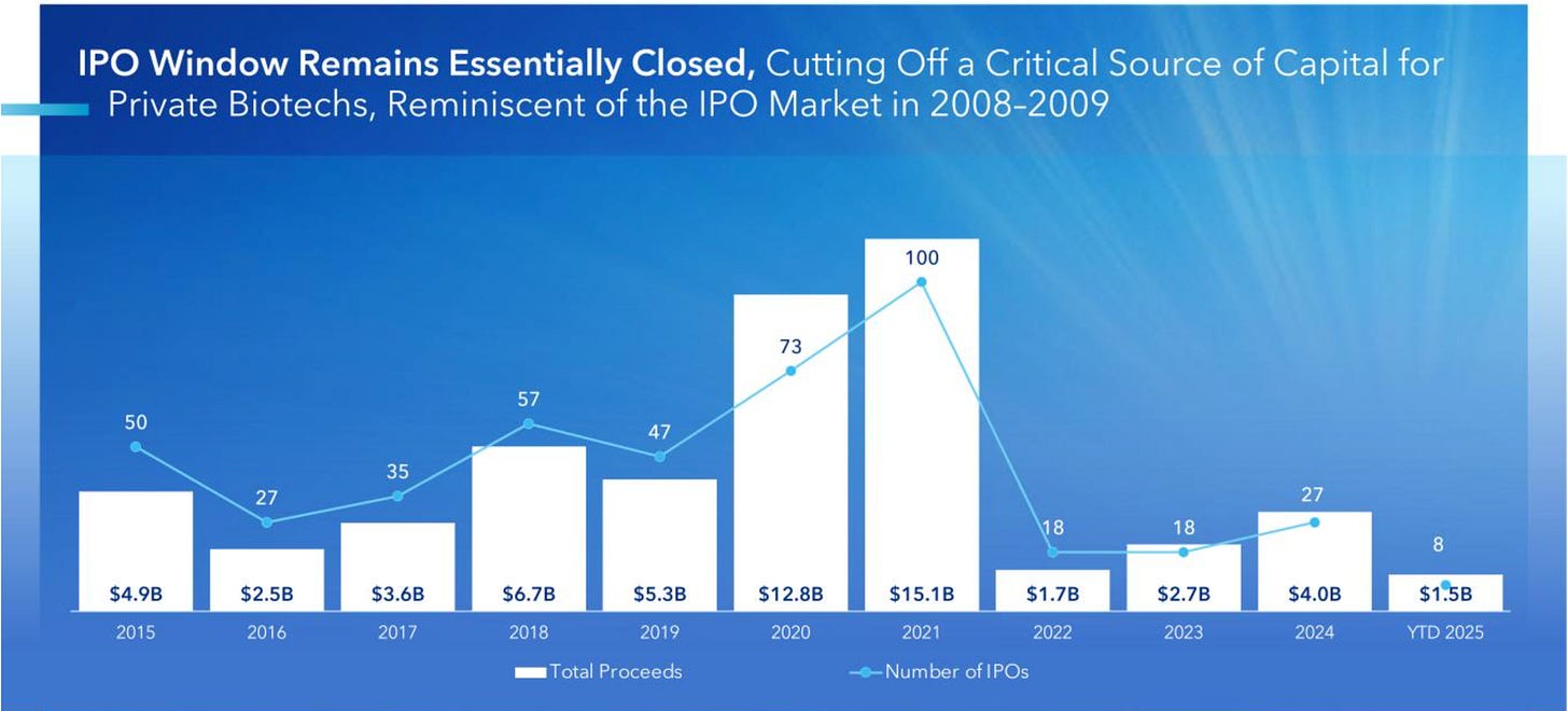 Going public isn’t a great option for new life science companies either.